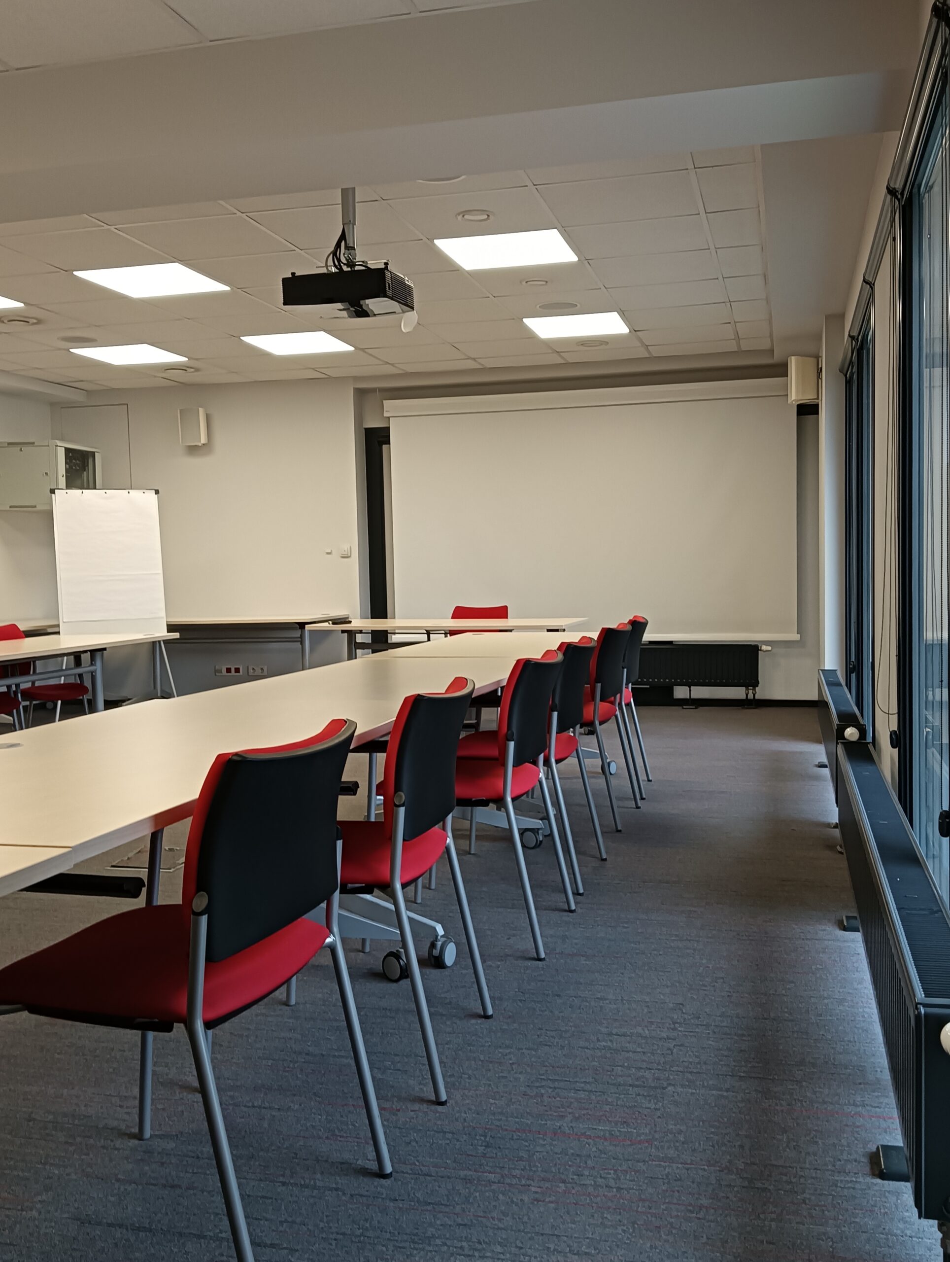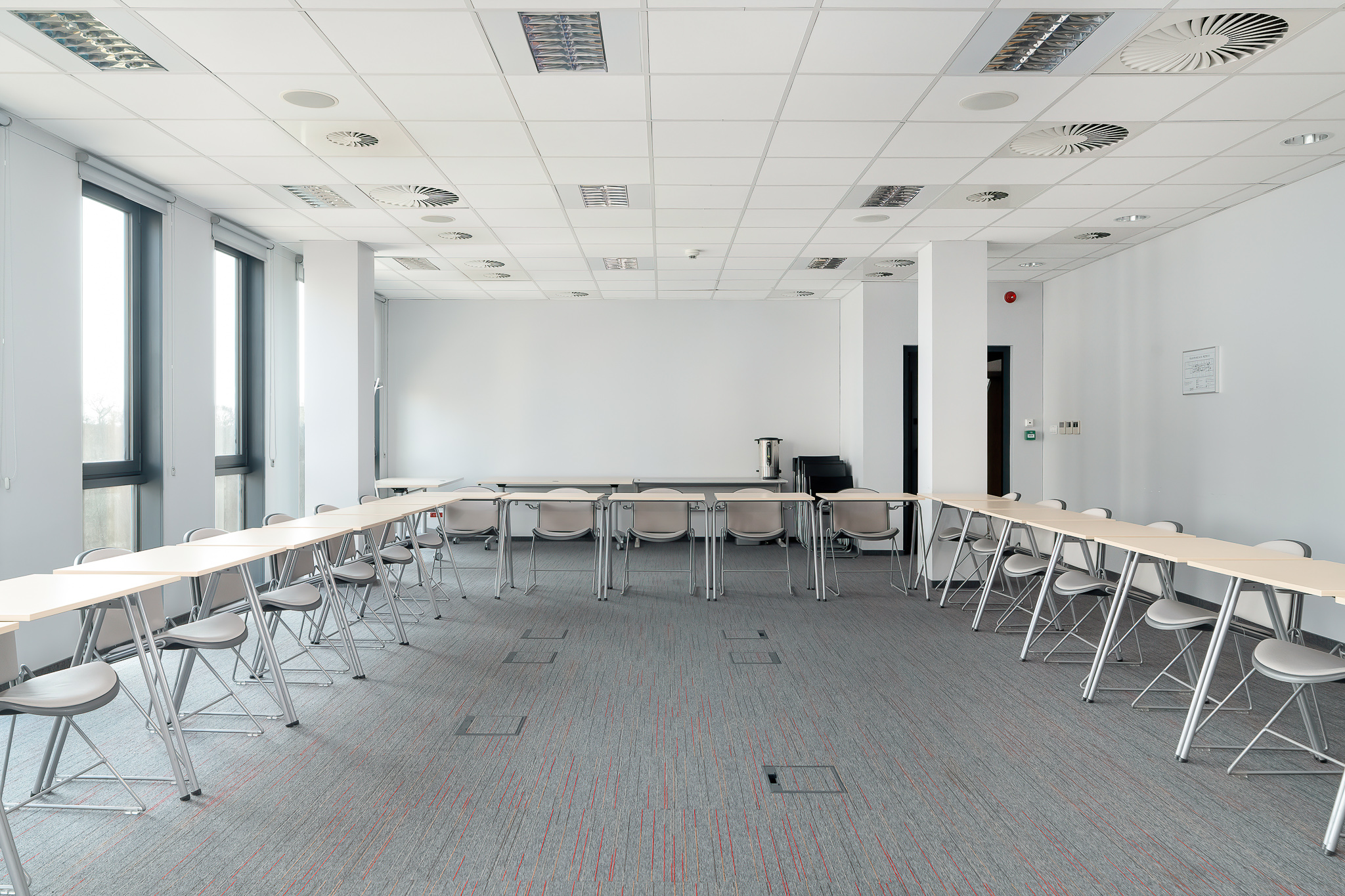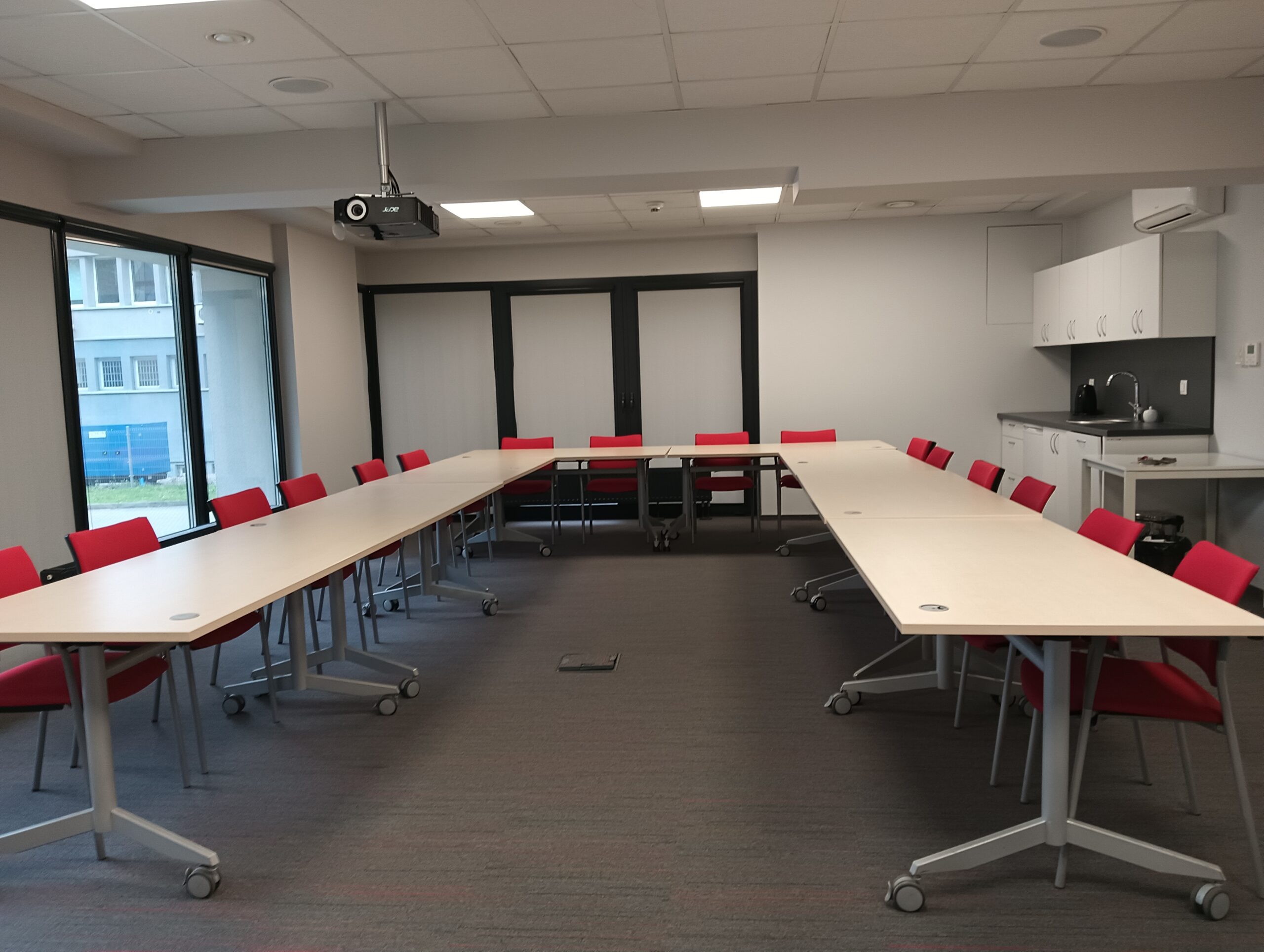 The room is equipped with a multimedia projector, screen, flipchart, and notebook. A fully equipped kitchenette is located directly in the room. The room is air-conditioned and has Wi-Fi access. The room size is 56 m².