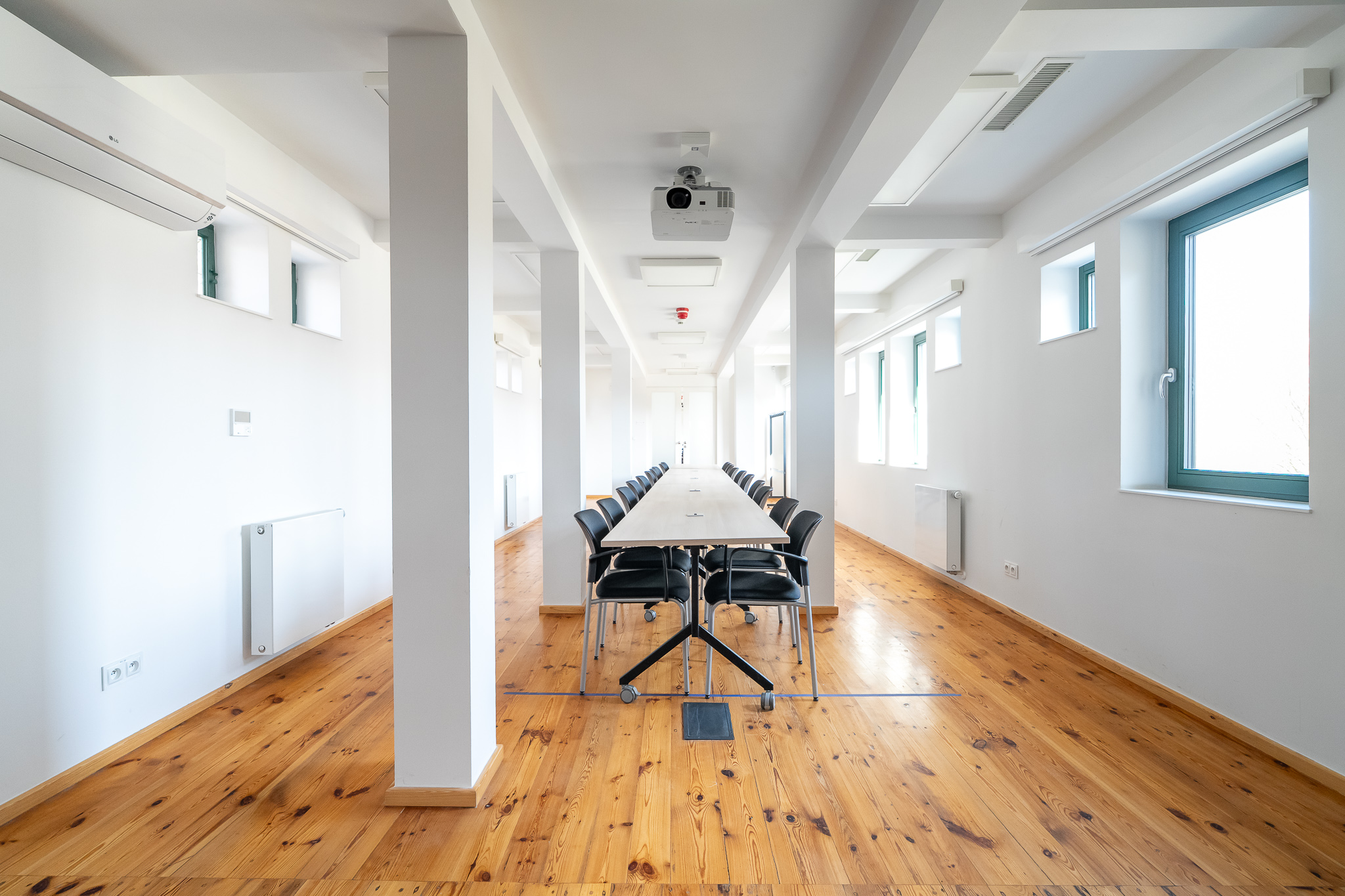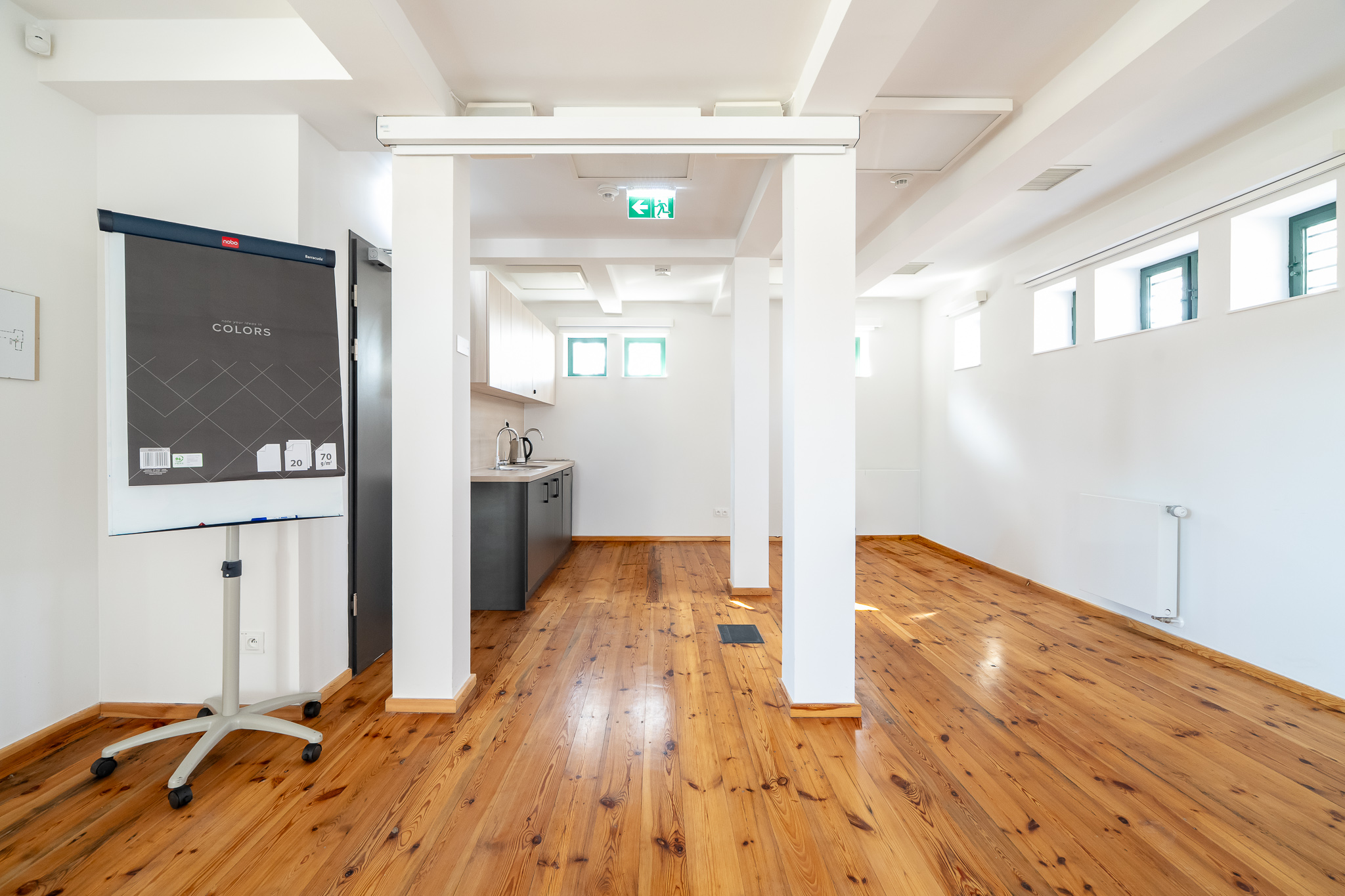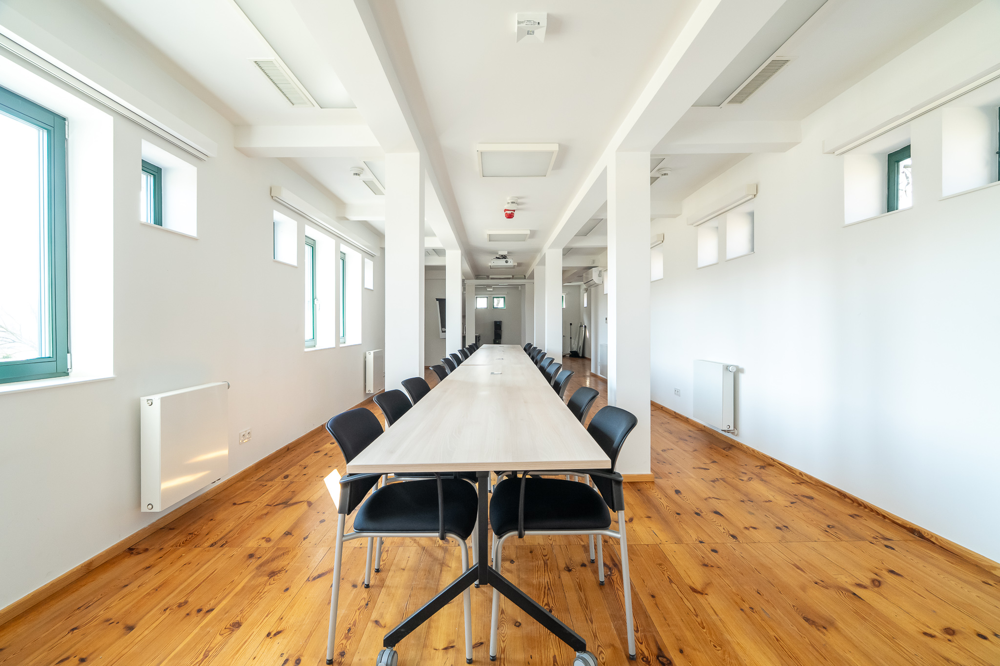 The interiors of both rooms are minimalist in style, creating a functional space that, in addition to classic meetings or training sessions, also allows for creative workshops.